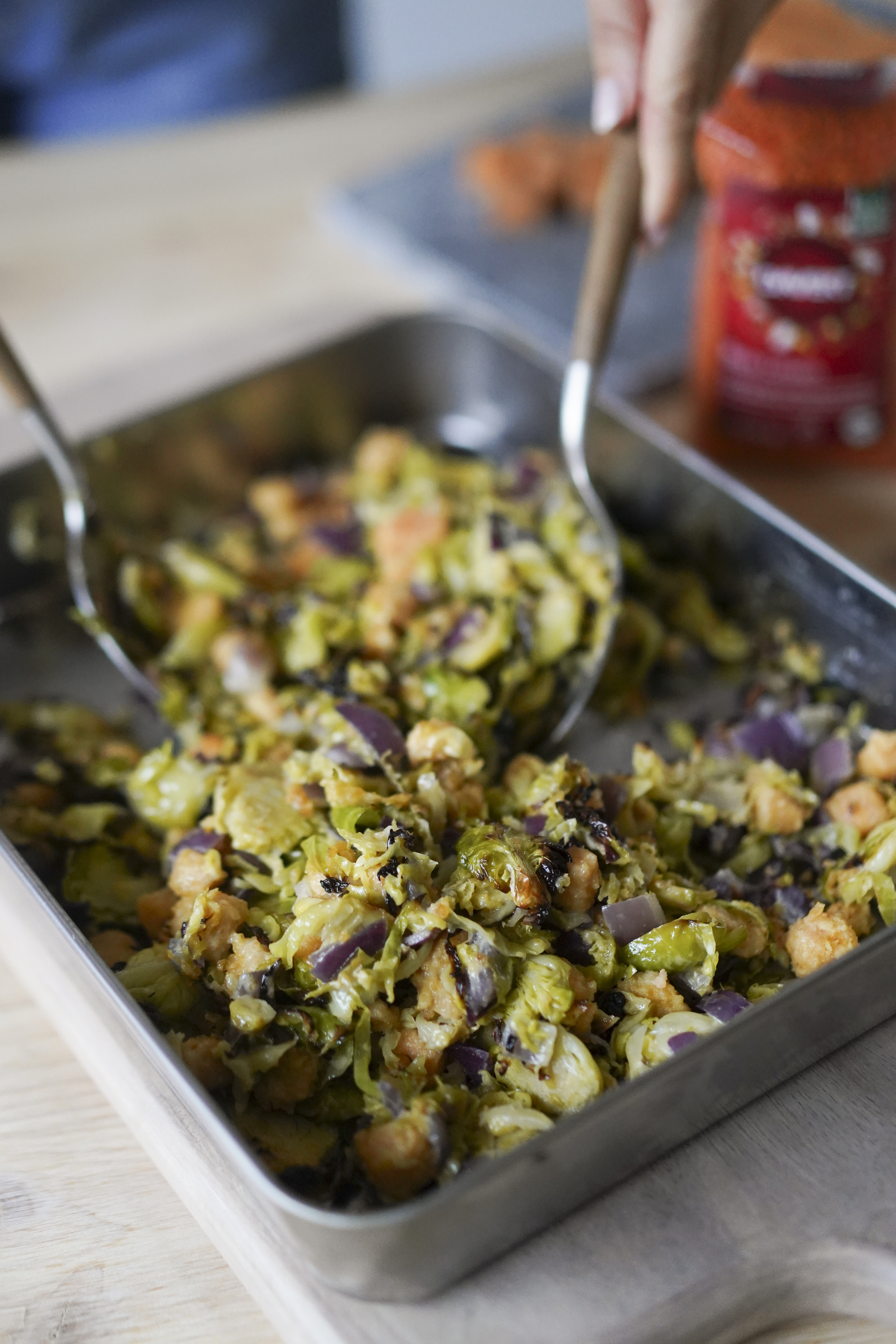 - Den Rosenkohl putzen, die äußeren Blätter entfernen und die Röschen in feine Streifen schneiden. Die Zwiebeln schälen, grob hacken und mit dem Rosenkohl in eine Auflaufform geben. Mit 3 EL Olivenöl, Salz und Pfeffer benetzen. Bei 250 Grad im Ofen ca. 8 - 10 Minuten rösten.