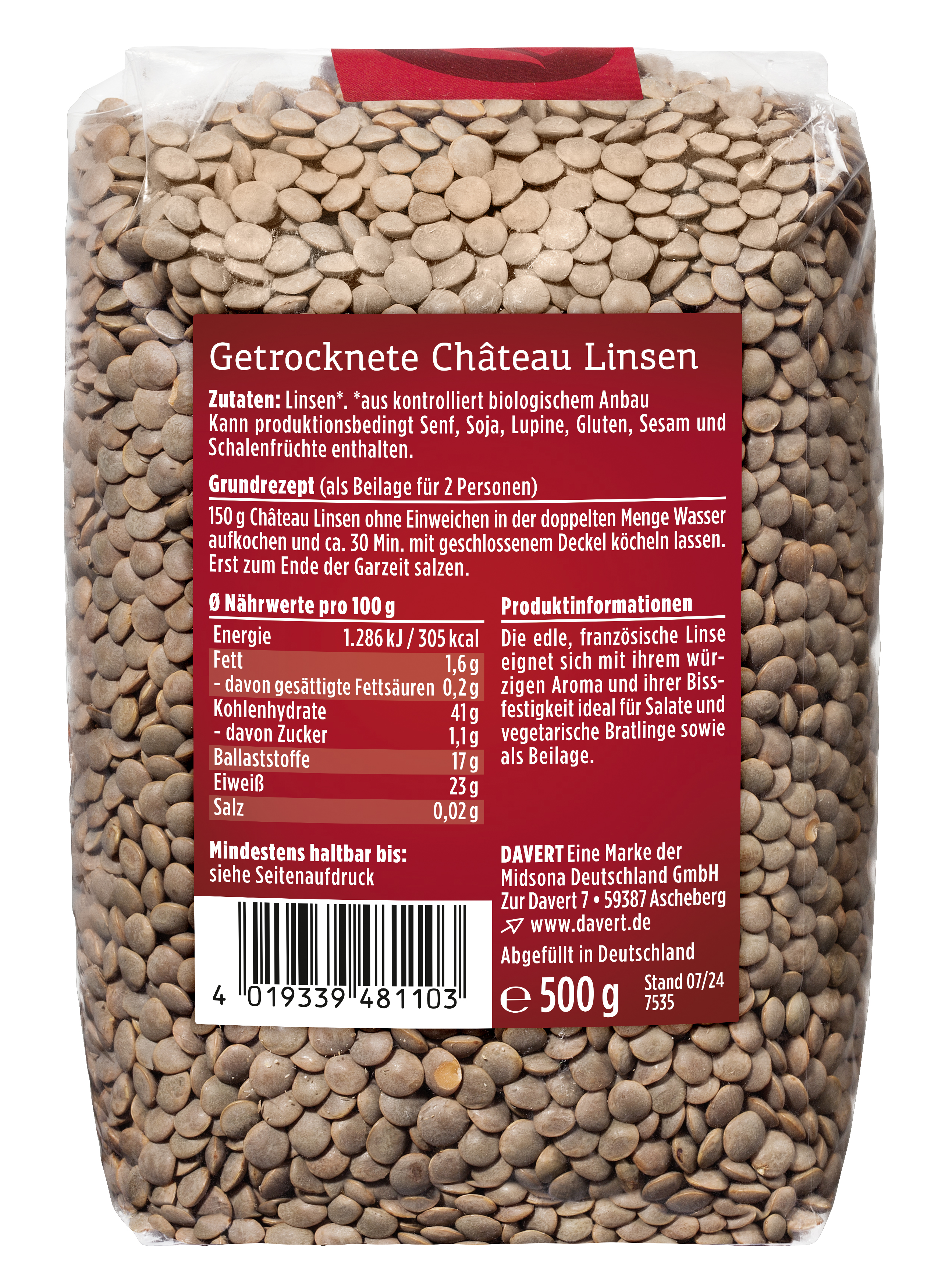 150 g Château Linsen ohne Einweichen in der doppelten Menge Wasser aufkochen und ca. 30 Min. mit geschlossenem Deckel köcheln lassen. Erst zum Ende der Garzeit salzen.