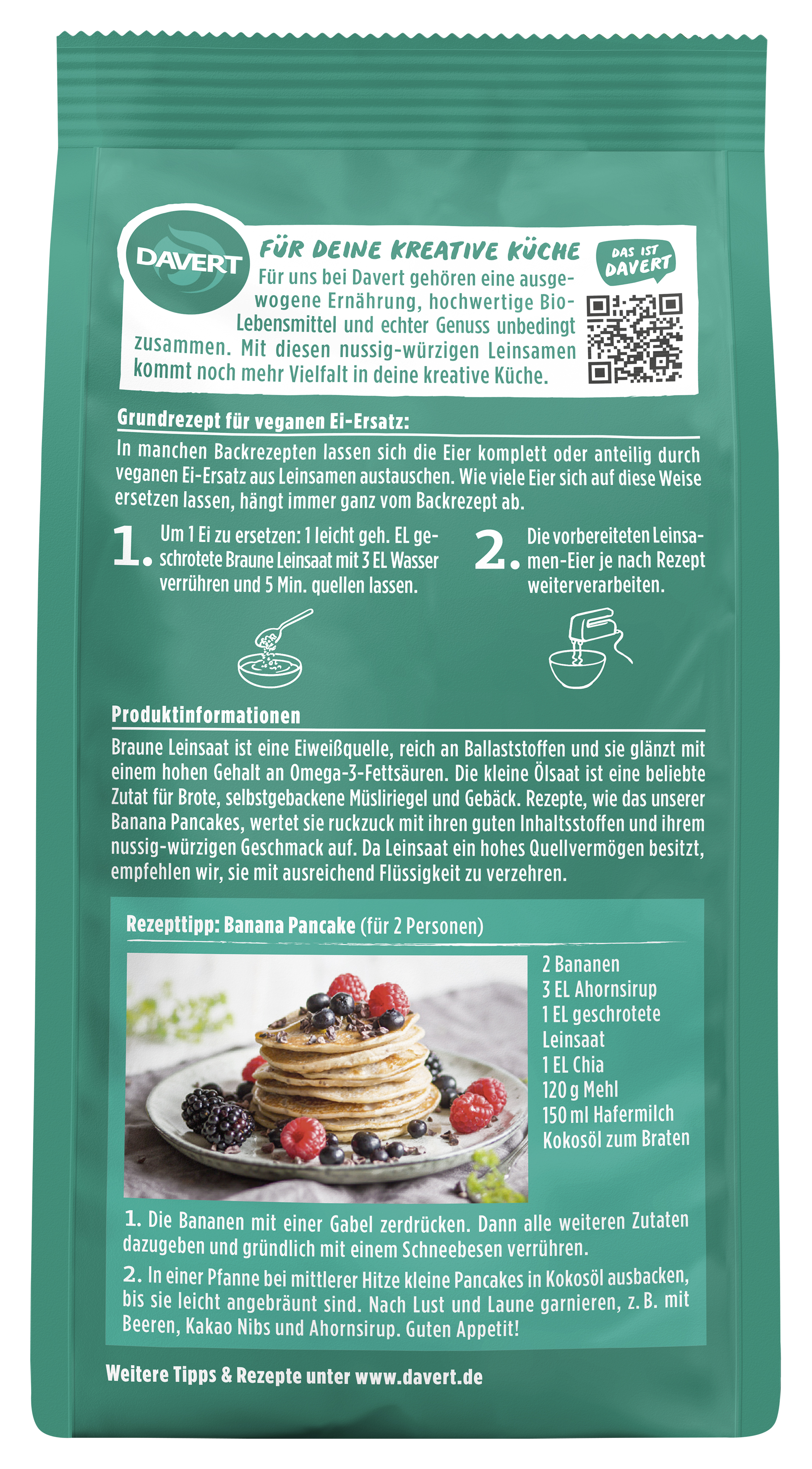 Braune Leinsaat ist eine Eiweißquelle, reich an Ballaststoffen und sie glänzt mit einem hohen Gehalt an Omega-3-Fettsäuren. Die kleine Ölsaat ist eine beliebte Zutat für Brote, selbstgebackene Müsliriegel und Gebäck. Rezepte, wie das unserer Banana Pancakes, wertet sie ruckzuck mit ihren guten Inhaltsstoffen und ihrem nussig-würzigen Geschmack auf. Da Leinsaat ein hohes Quellvermögen besitzt, empfehlen wir, sie mit ausreichend Flüssigkeit zu verzehren.
