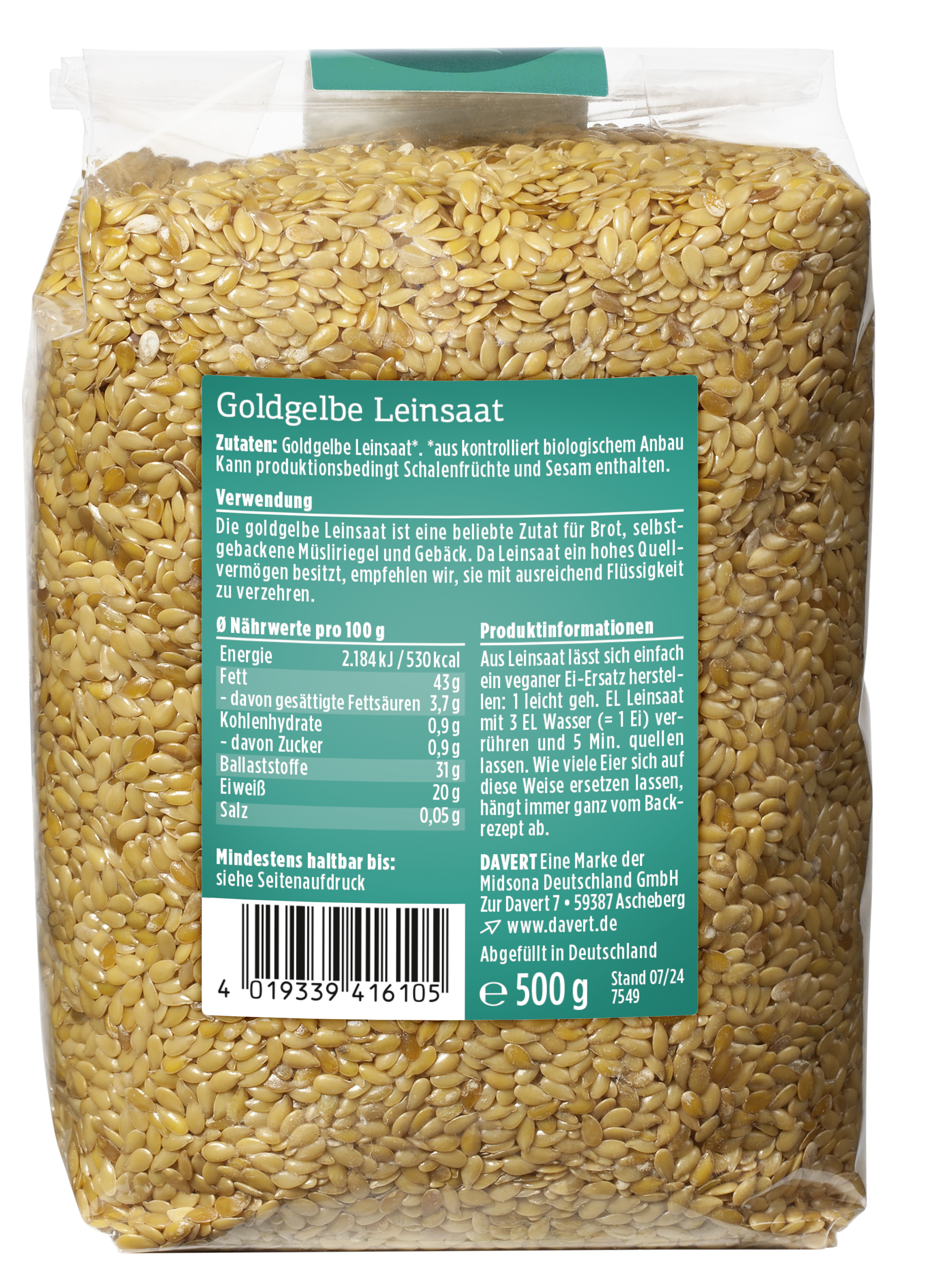 Die goldgelbe Leinsaat ist eine beliebte Zutat für Brot, selbstgebackene Müsliriegel und Gebäck. Da Leinsaat ein hohes Quellvermögen besitzt, empfehlen wir, sie mit ausreichend Flüssigkeit zu verzehren.
