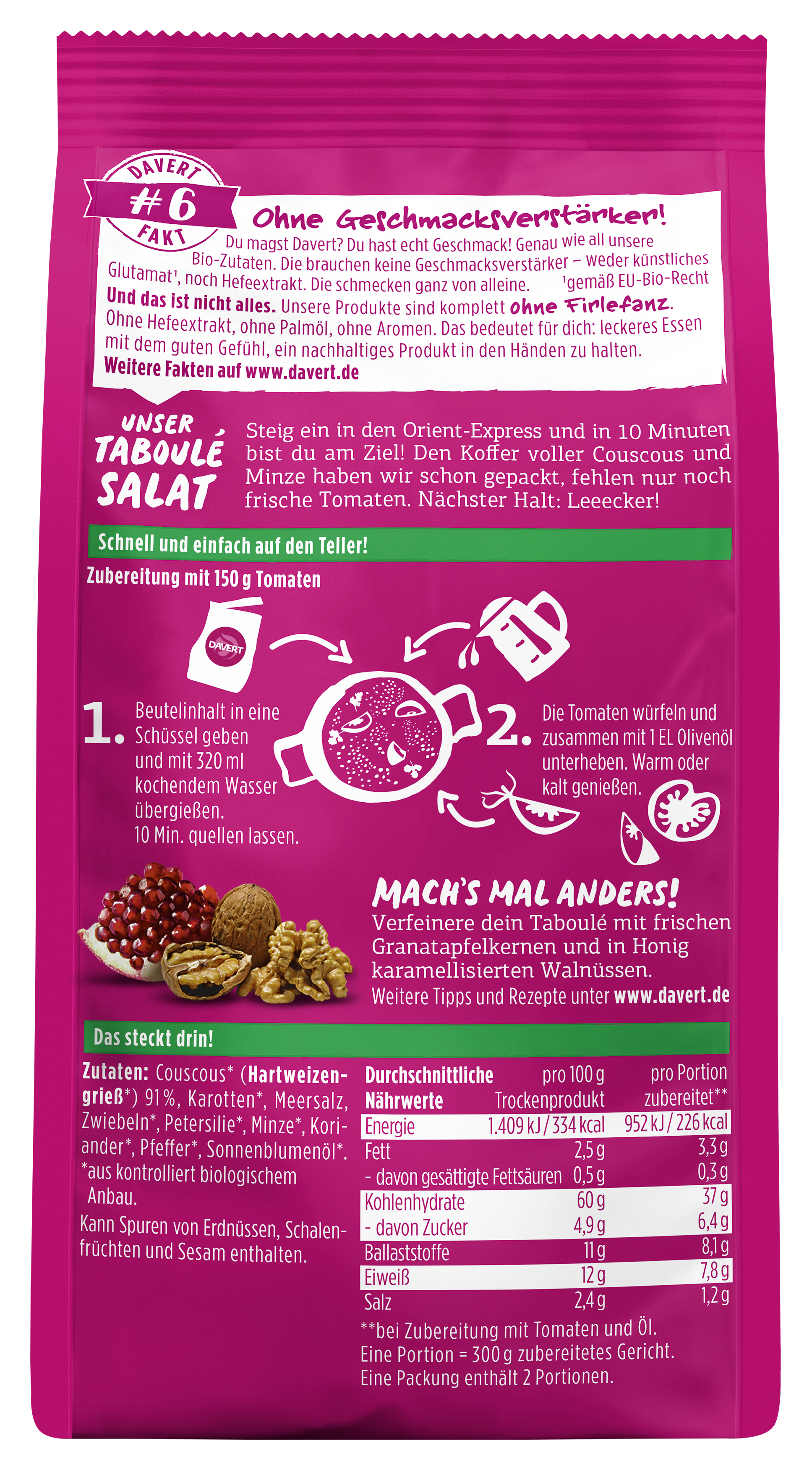 Tauchen Sie ein in den Geschmack des Orients mit unserem Taboulé Salat von Davert. Feiner Couscous, aromatische Petersilie, frische Minze und eine ausgewogene Mischung landestypischer Gewürze vereinen sich zu einem authentisch orientalischen Geschmackserlebnis. Genießen Sie diesen erfrischenden Salat als leichte Mahlzeit oder als delikate Beilage. Mit Daverts Taboulé Salat bringen Sie die Vielfalt und den Genuss des Orients direkt auf Ihren Teller.