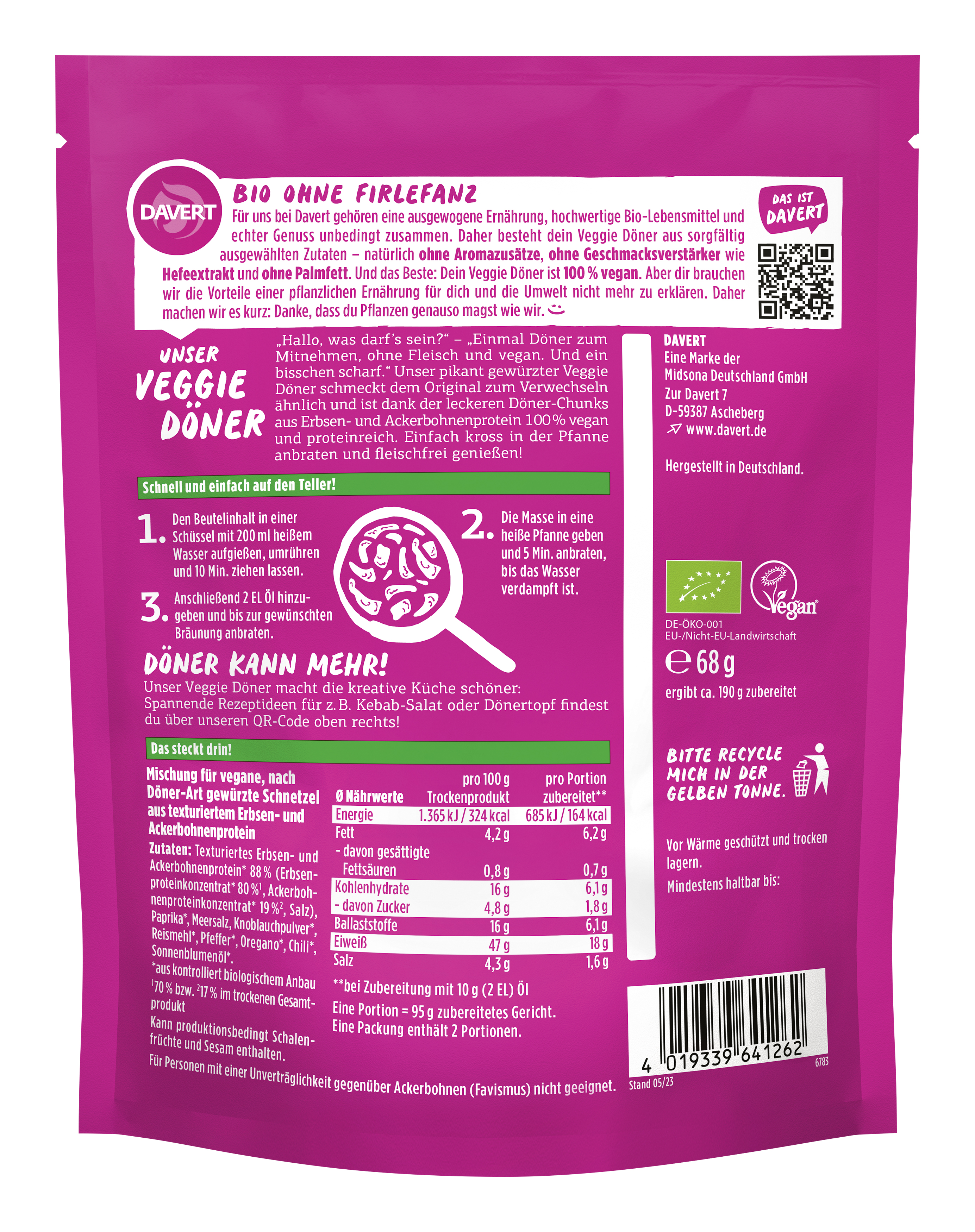 „Hallo, was darf’s sein?“ – „Einmal Döner zum Mitnehmen, ohne Fleisch und vegan. Und ein bisschen scharf.“ Unser pikant gewürzter Veggie Döner schmeckt dem Original zum Verwechseln ähnlich und ist dank der leckeren Döner-Chunks aus Erbsen- und Ackerbohnenprotein 100% vegan und proteinreich. Einfach kross in der Pfanne anbraten und fleischfrei genießen!